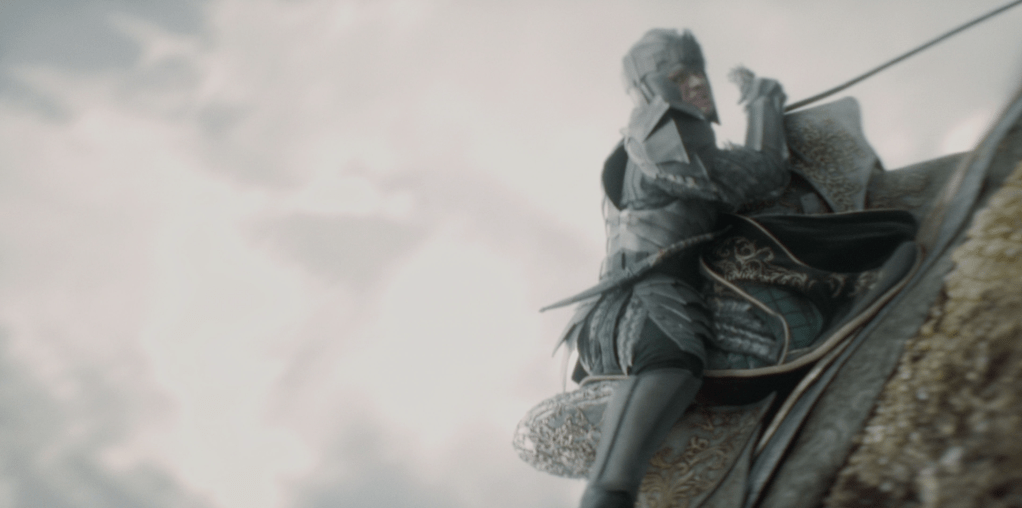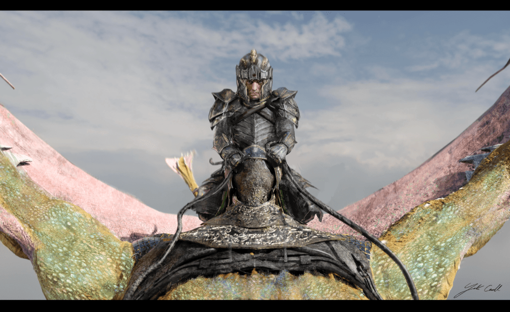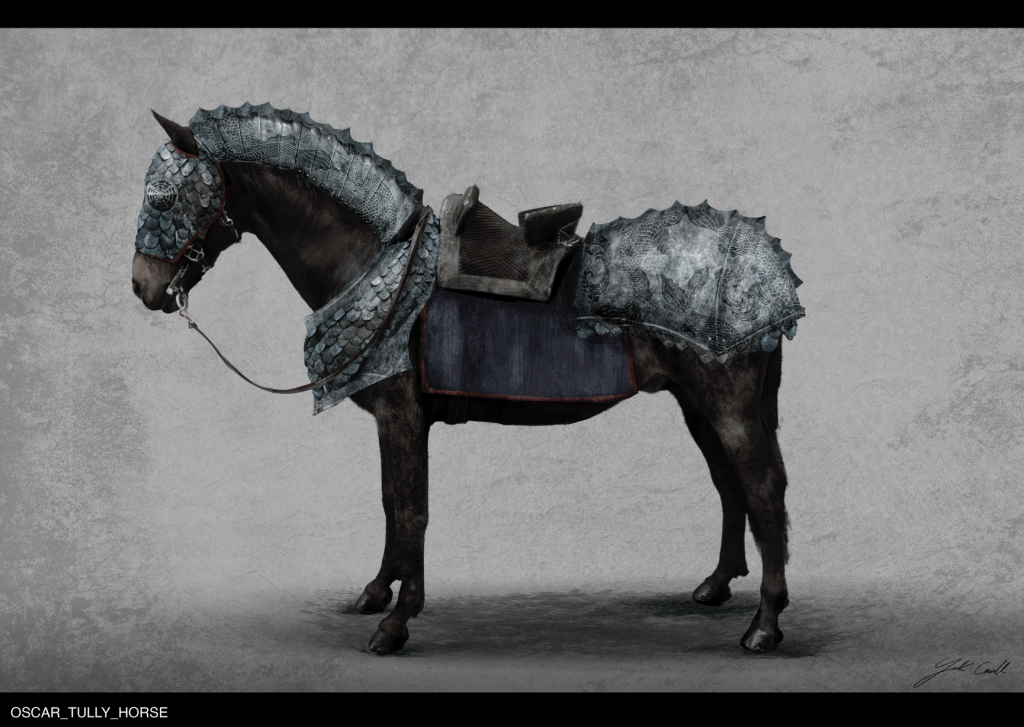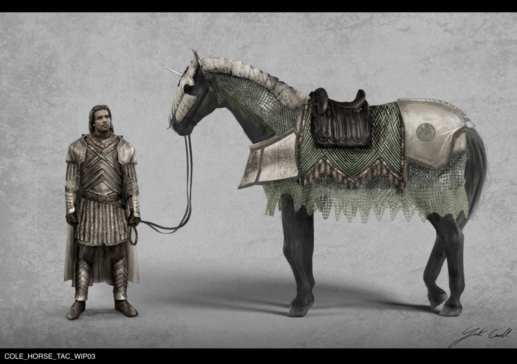 MOONDANCER : Baela’s saddle was briefed as – designed for a confident dragon rider, we riffed from the characters riding costume for some consistency . Developing the black layered scales on the buck nose into the buck neck mail and scale armour, as with all the designs I worked heavily from nature using biomimicry as a key design theme – Mondancer’s in particular was influenced heavily by the forms of beetles like the Pray Mantis and species of Trilobite beetle. Coupled with heavy inspiration from ancient Chinese armour and Samurai helmets, the saddle takes on a slick organic feel webbed to Moondancer’s back.