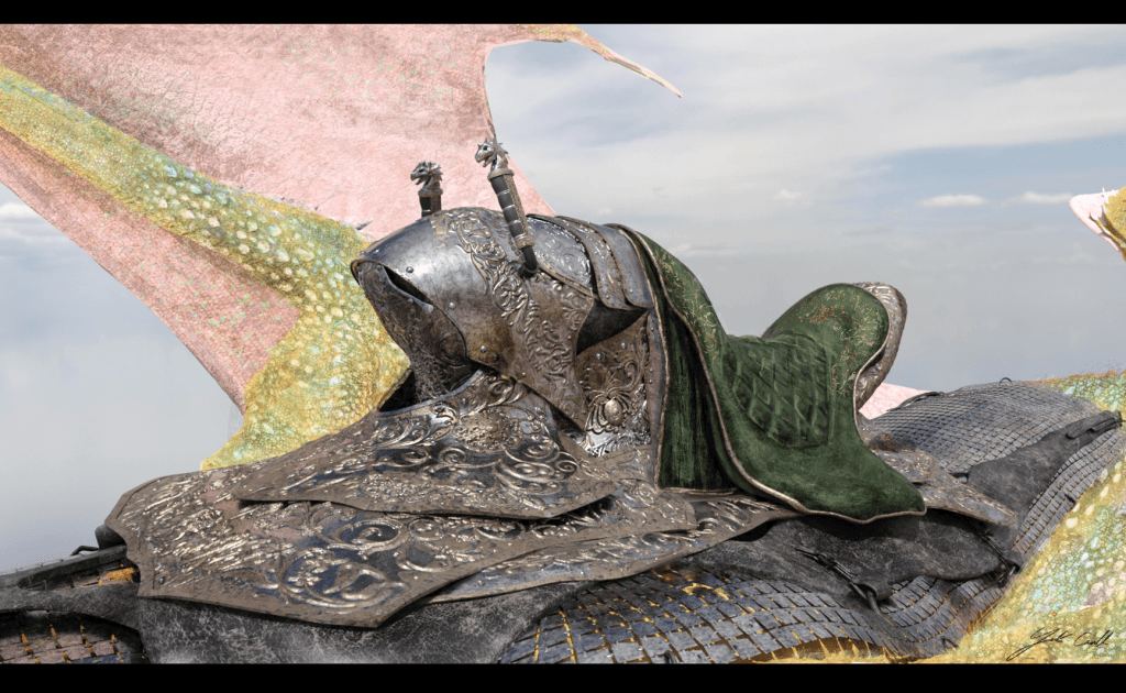 SUNFYRE : King Aegon’s saddle is the most ornate of all the saddles, it was briefed that it needed to clash with Aegon’s armour, as he would be donning ‘Aegon the Conquerors’ Valyrian armour for the scene. This saddle had some preliminary design from season 1, so I took these elements and went completely over the top to create ornate and embellished show pony of a saddle. The armour is heavily influenced by ornate royal Spanish armour of the 1500s , and baroque style riding saddles, coupled with custom motorcycle engraving. The form of the buck again insect like riffs from the shapes of the Brenthis Daphne crystalis.
